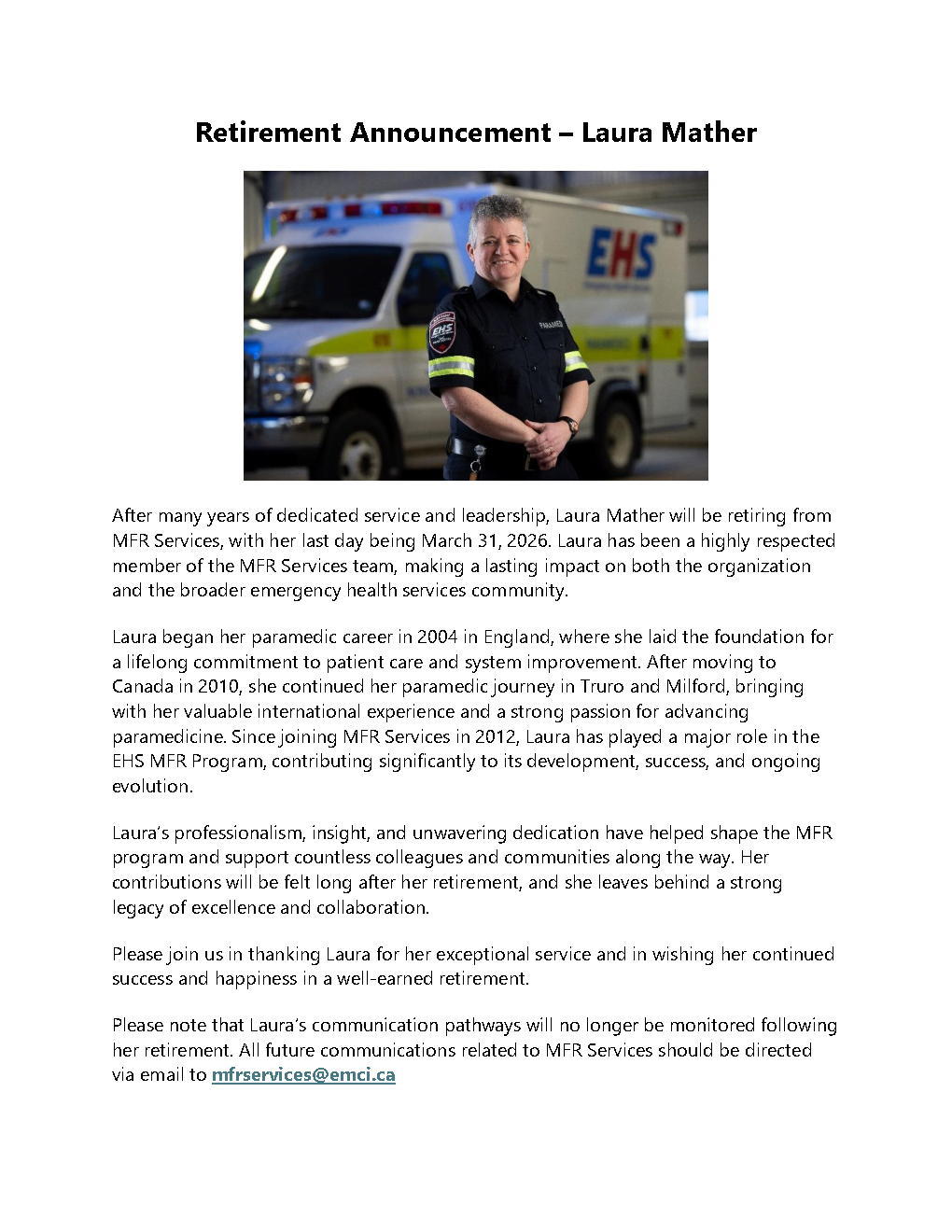 Retirement Announcement – Laura Mather Home News & Notices Retirement Announcement – Laura Mather Previous Post Save the Date – EHS MFR Expo - April 17–18, 2026 in Wolfville. Registration link will be sent to All "ACTIVE" EHS MFRs on Friday February 6th
